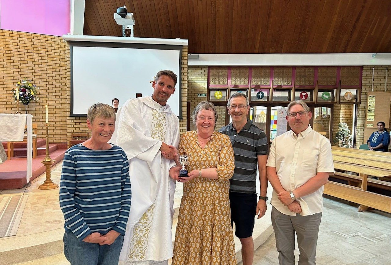 Congratulations to ‘Not So Deadly’ from St Mary’s in Poole who were crowned this year’s Overall Great Big Diocesan Quiz winners back on Friday, 9 May 2025. They scored an amazing 93.5 out of a possible 130 marks. Pictured here are 4 of the 6 team members – Ann, Tina, Pete and Fred who received their trophy from Fr Phil Carroll.